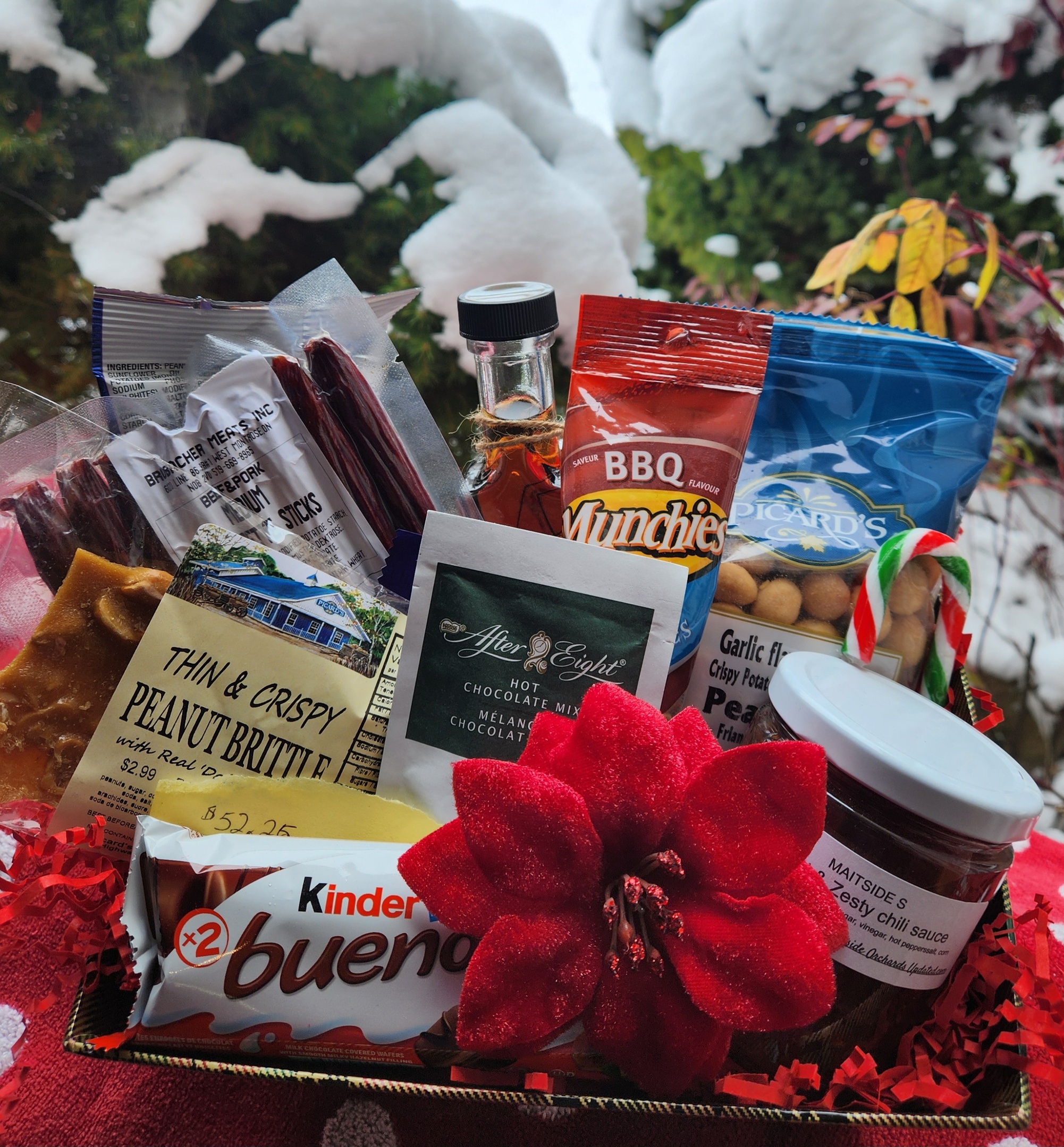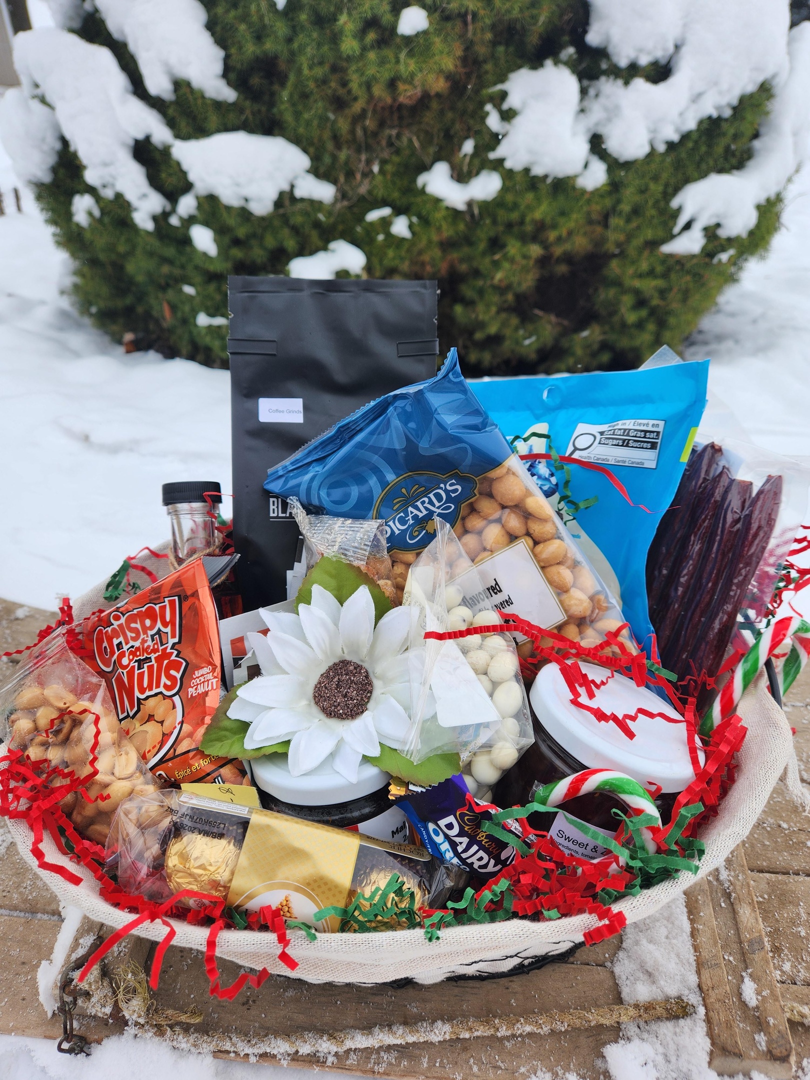 Our large basket is filled with local specialties ! A wide variety of healthy, salty & sweets.!